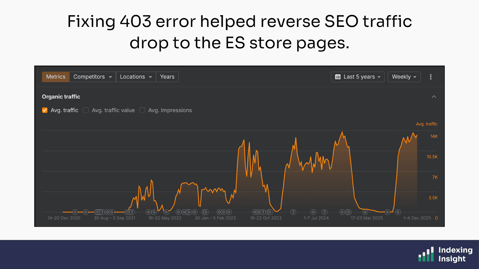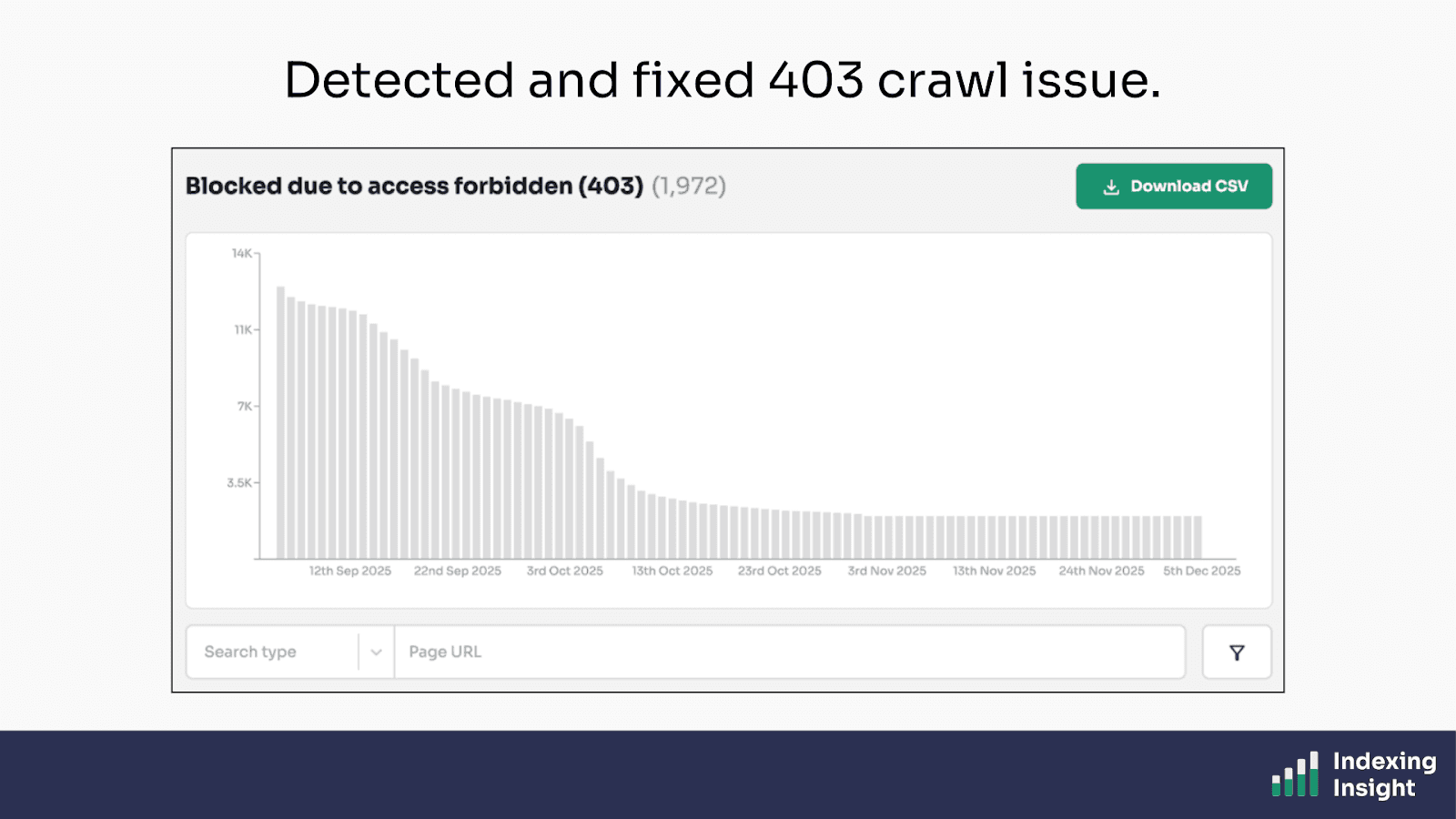 Indexing Insight flagged that Google was being blocked from crawling the Spanish store pages due to a 403 error caused by blocking Googlebot. This meant these pages were deindexed by Google.