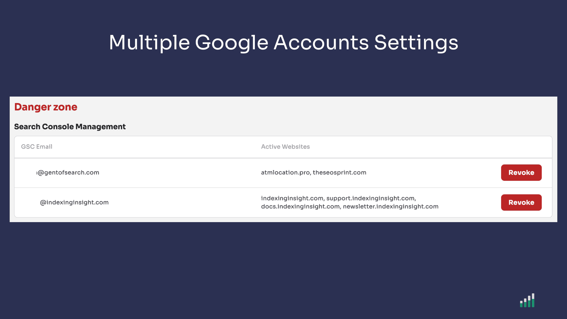At Indexing Insight, we’ve built a solution that allows our customers to log in and add multiple Google Search Console accounts.